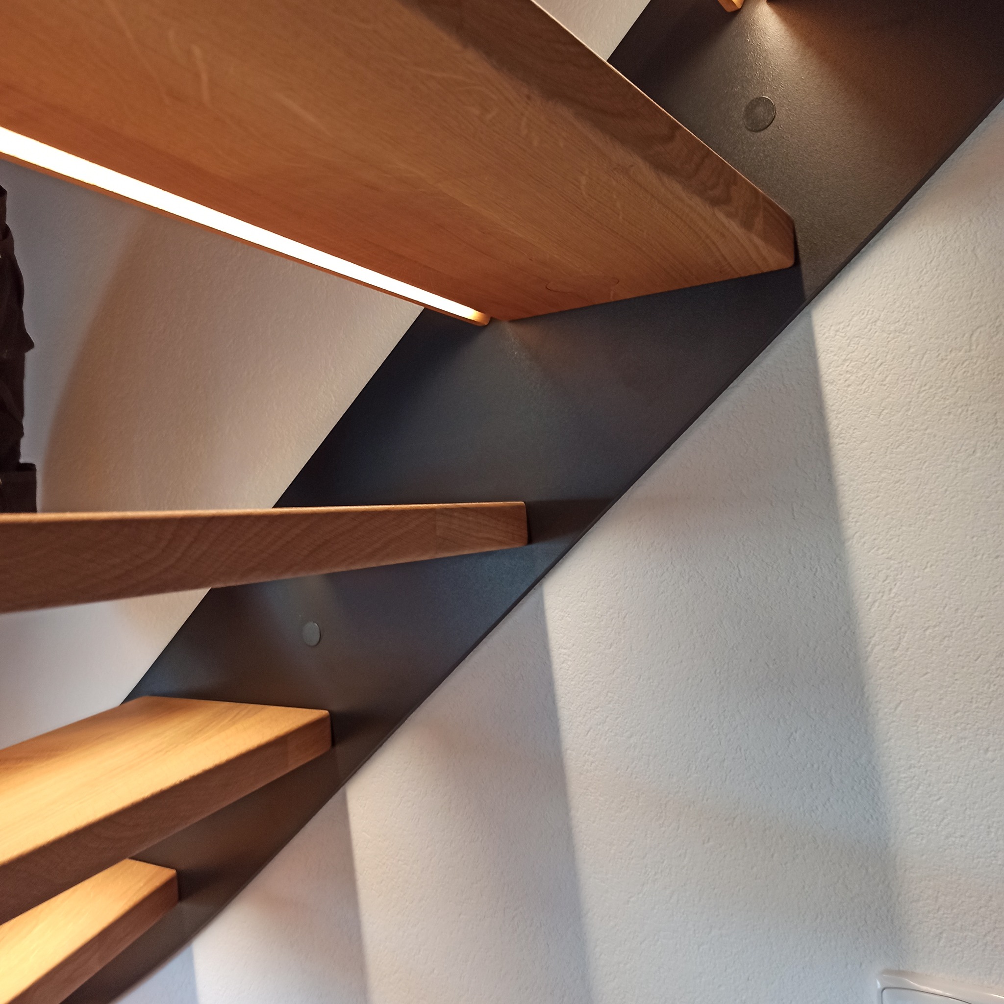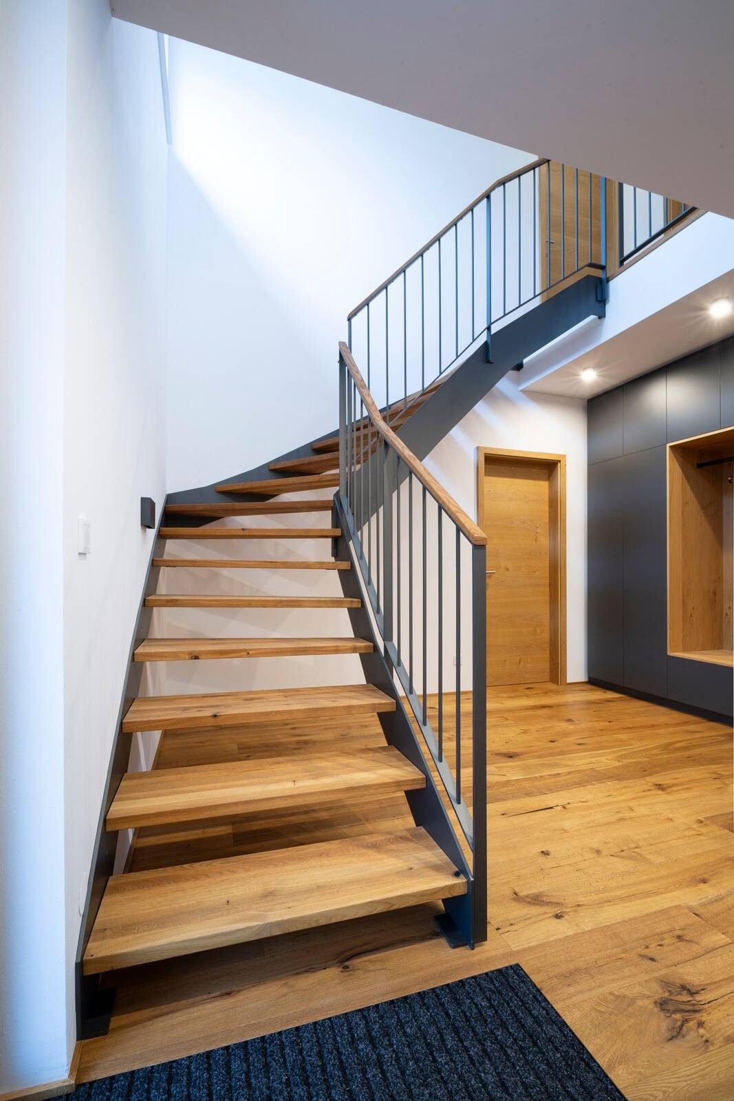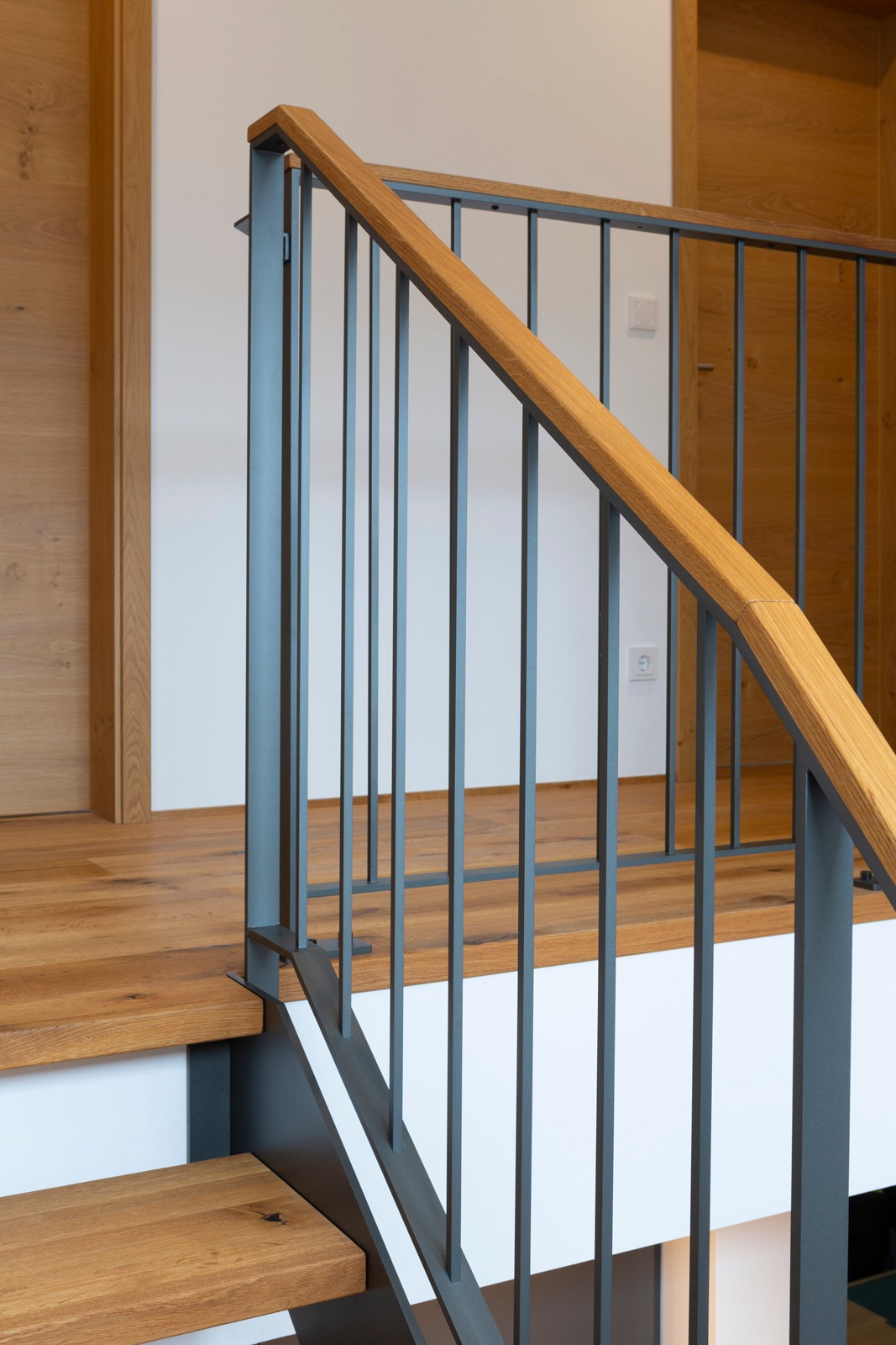 In Kombination entsteht ein modernes Design, das gleichzeitig zeitlos wirkt – ein Markenzeichen hochwertiger Treppenbaukunst.